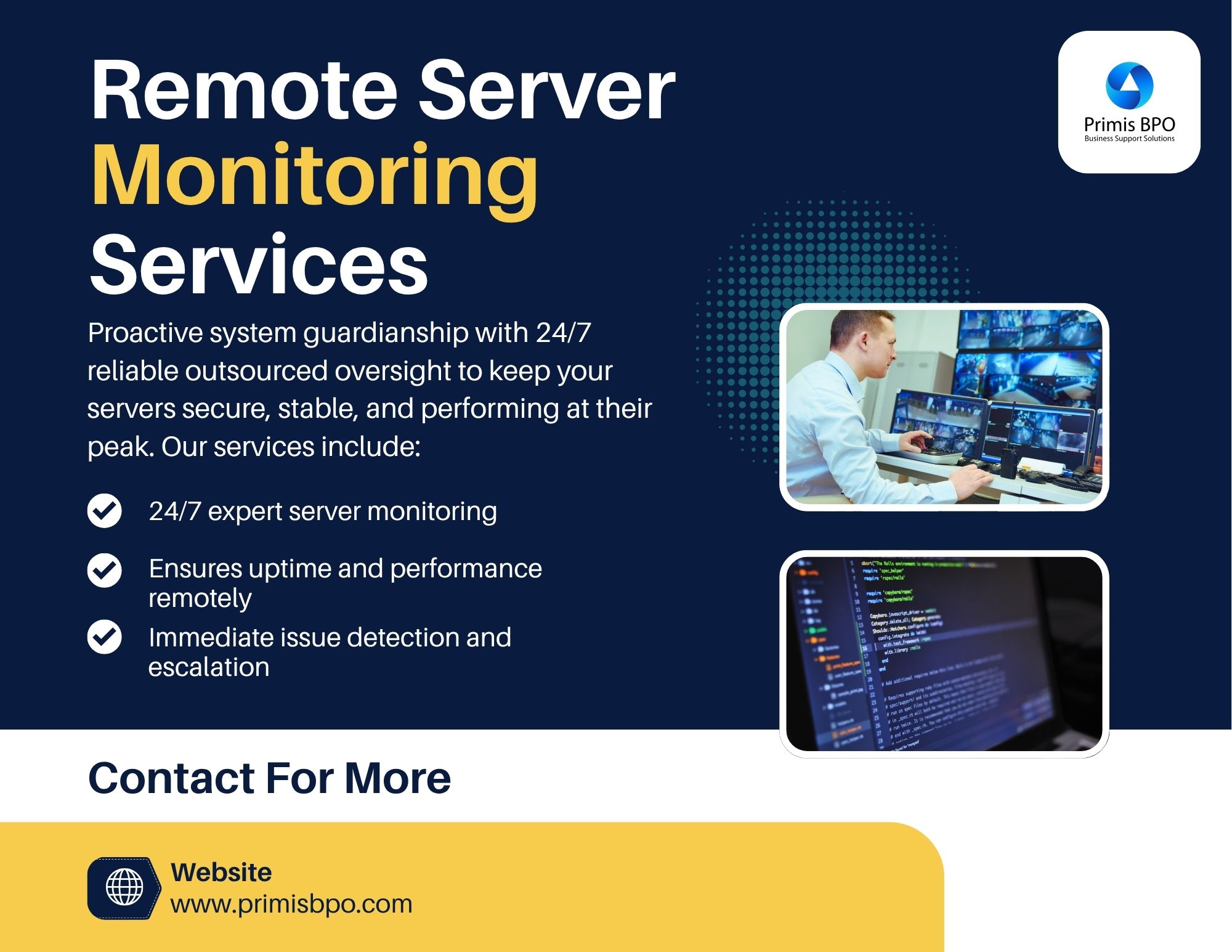 Outsourcing remote server monitoring to a trusted partner ensures 24/7 vigilance over your IT infrastructure, with real-time tracking of server performance and connectivity. Our expert teams are trained to swiftly detect, escalate, and resolve issues, minimizing downtime and maintaining uninterrupted service.