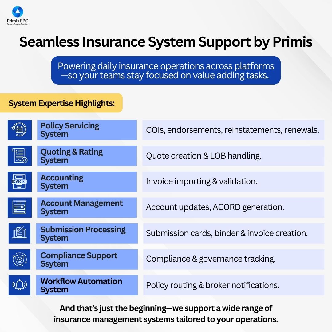 At Primis, backed by a tech powerhouse with over 30 years of insurance expertise, we support day-to-day workflows across leading insurance management platforms, so your teams can focus on underwriting, service delivery, and growth. From quoting to invoicing, compliance to content management, we ensure your systems run smoothly—accurately, efficiently, and on time. Learn more→