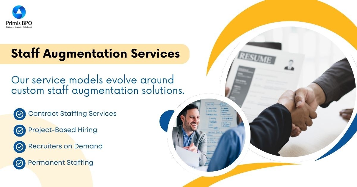 Outsourcing staff augmentation services with Primis BPO simplifies recruitment processes by providing flexible and tailored hiring solutions that adapt to evolving business needs. By handling tasks such as Contract Staffing Services, Project-Based Hiring, etc., Primis streamlines hiring, reduces costs, and enhances the overall experience. This approach improves hiring efficiency and fosters stronger customer retention through a seamless staffing process. Learn more→